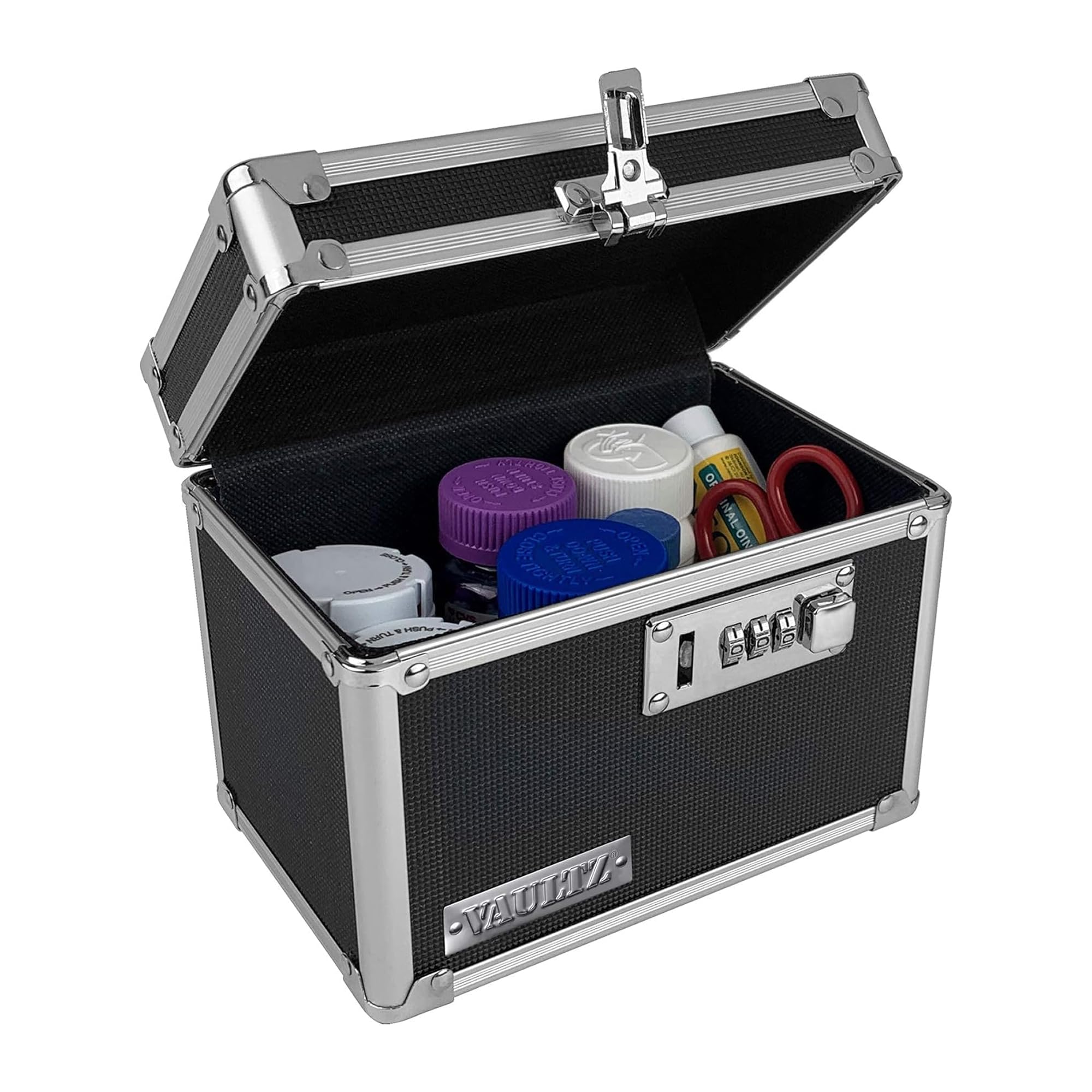The Vaultz Medicine Lock Box is a compact, durable safe designed to protect medications and small valuables. Featuring a reinforced aluminum body with steel corners, a user-friendly combination lock, and a soft felt interior, it offers secure, scratch-free storage in a sleek 5x7x5 inch design. Perfect for professionals seeking discreet, reliable security without the hassle of keys.