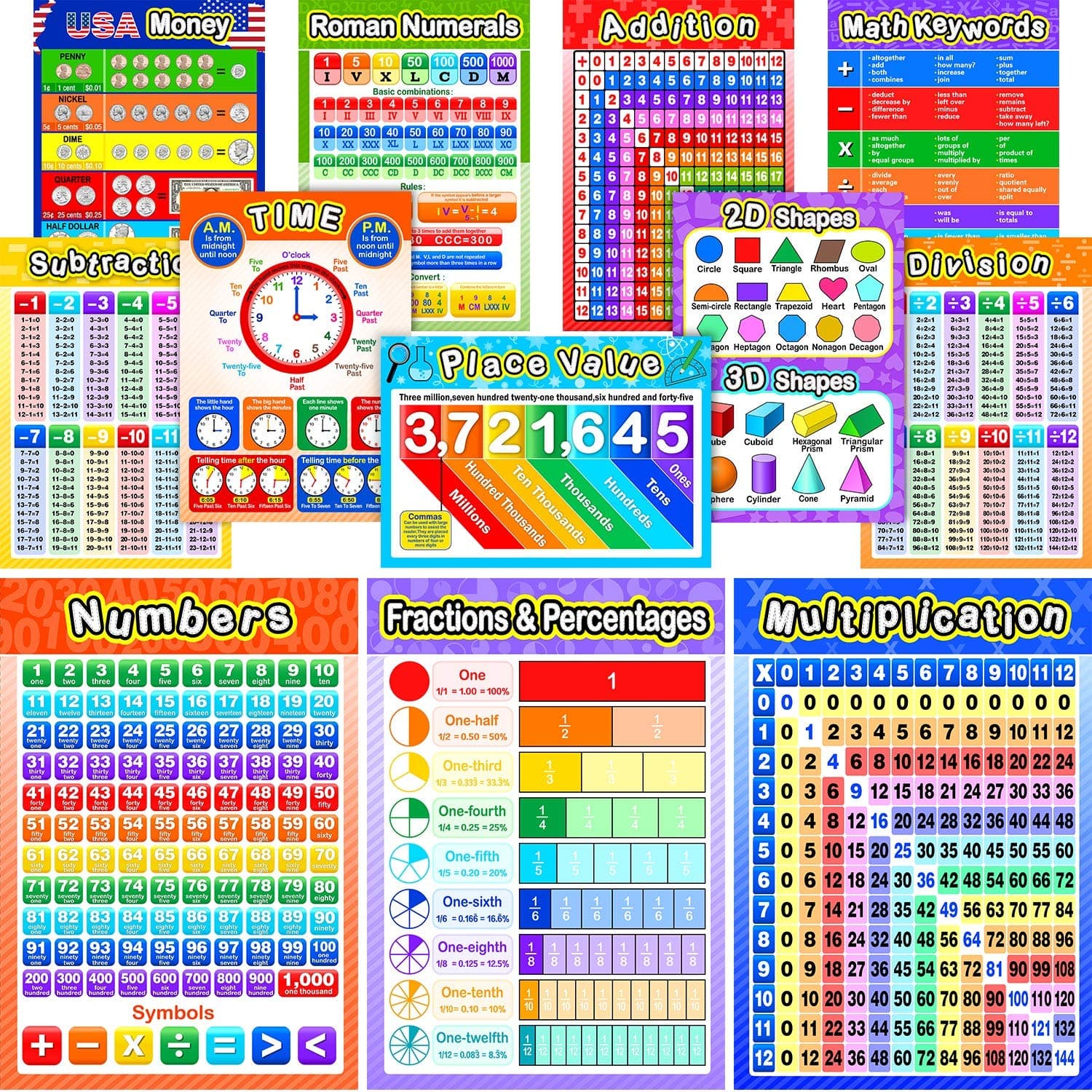 Blulu’s 12-piece educational math poster set features vibrant, waterproof, and tear-resistant 16x11 inch posters designed for elementary and middle school learners. Made from durable 250gsm cardstock with a glossy PET film finish, these posters are dry-erasable and come with 80 glue point dots for easy, damage-free wall mounting. Ideal for interactive learning in classrooms or at home, they cover essential math topics including multiplication, division, addition, subtraction, fractions, and decimals.