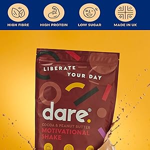 Dare Motivation is a nutritionally complete vegan meal replacement shake delivering 20g of high-quality plant protein, all 26 essential vitamins and minerals at 100% RDA, slow-release low-GI carbs, and a potent botanical blend. Enhanced with 10 billion probiotics and omega-3s, it supports sustained energy, digestive health, and immune function in a delicious cocoa & peanut butter flavor.