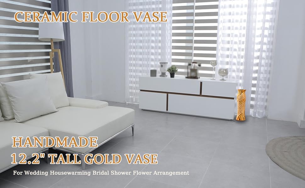 This 12-inch tall gold ceramic vase features a durable electroplated glaze for a radiant, long-lasting finish. Its nature-inspired wavy open mouth and widened base provide both aesthetic appeal and stability, making it a versatile centerpiece suitable for fresh or dried flowers. Handcrafted and kiln-fired, it seamlessly enhances any décor style from contemporary to farmhouse, perfect for gifting or personal luxury.