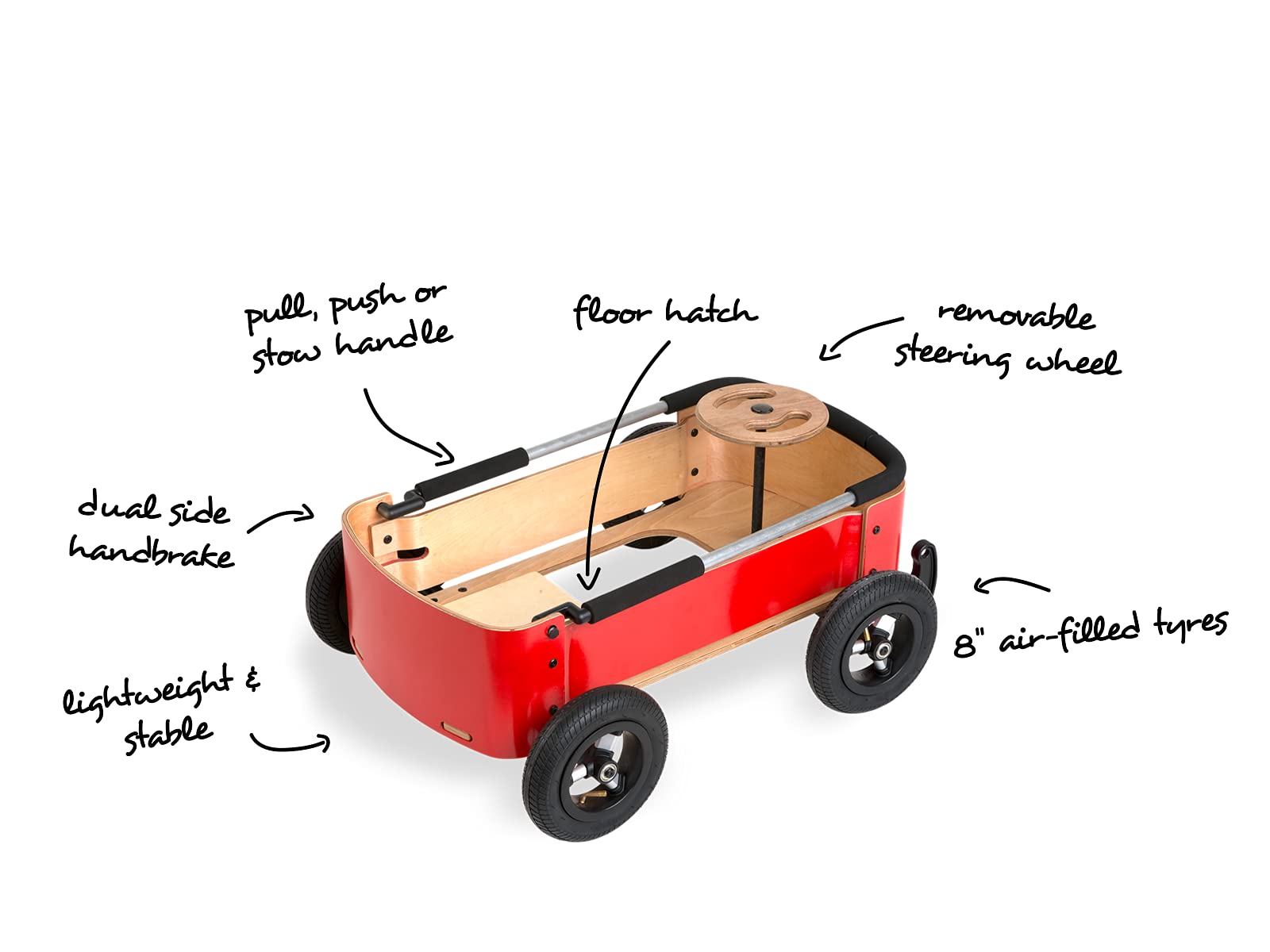 The Wishbone Wagon 3-in-1 is a classic red wagon designed for outdoor fun, transforming effortlessly into a soap box racer and foot-to-floor car. Built with premium materials and featuring a functional steering wheel, it promises a safe and enjoyable ride for children aged 12 months to 10 years.