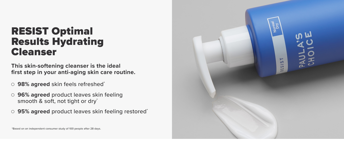 Paula's Choice RESIST Optimal Results Hydrating Cleanser is a 6.4 oz anti-aging face wash designed for dry skin. Infused with green tea and chamomile, it gently removes makeup and impurities while restoring moisture and preserving the skin’s natural barrier. Safe for use around the eyes, fragrance-free, and cruelty-free, this cleanser delivers smoother, softer, and younger-looking skin with consistent use.