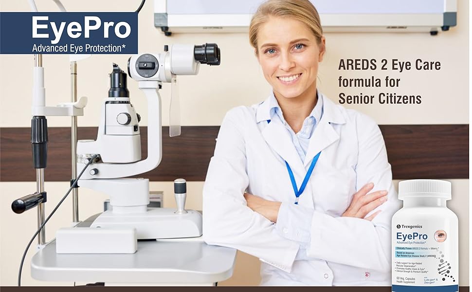 Trexgenics EyePro AREDS-2 is a premium eye health supplement featuring a clinically validated formula with Lutein, Zeaxanthin, Zinc, Copper, and Bilberry. Designed to support age-related macular degeneration prevention and overall vision clarity, it uses high-quality branded ingredients to ensure maximum efficacy and stability in a convenient 60-vegetarian capsule pack.