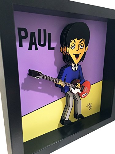 This Beatles Paul McCartney 3D Art is based on the iconic Beatles cartoon. The paper cut Paul McCartney is rendered in 2D while his face and bass are in 3D. The artwork is hand signed and come framed in a beautiful, black shadow box frame. The 3D effects really makes this 3D pop art pop! This is the perfect gift for any Paul McCartney or Beatles fan. Dimensions: 10×10″ framed