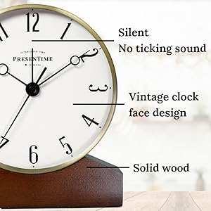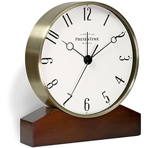 Presentime & Co Mozart Mantel Alarm Clock, Desk and Shelf Clock, Tabletop Decoration, 6 x 5.5 inch, Silent no Ticking, Wooden Base, Walnut Finish, Golden Color, Arabic Numeral