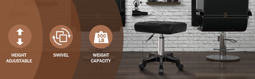 The FURWOO Rectangle Rolling Stool features a height-adjustable seat ranging from 45cm to 61cm, a 360° swivel for full mobility, and a compact, durable plastic base designed to save space. Supporting up to 300 lbs, it’s waterproof and easy to assemble solo in 10 minutes, making it ideal for spa, salon, or massage professionals seeking ergonomic efficiency and sleek functionality.