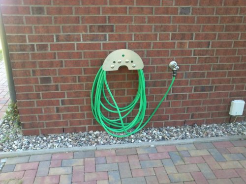 'This made from 2 mm stainless steel hose holder can store, depending on the loop size and up to 25 50 m 1/2 garden hose and is secured with three screws to the wall. It can be attached to suitable external holder,.Size (W x H x D) 325X180X135 mm³Due to the gebeizten Stainless Steel Design, it is resistant to environmental influences, rustless, anticorrosive and extremely durable. The product is certified to test requirements also suitable for use in cleaning systems and in the laboratory, hospitals and food industry.In this design are the four straps closed pipes with stainless steel end caps.
