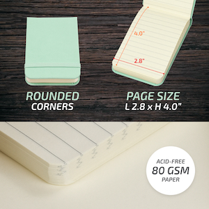 The Tiny Notebook 3x4 Small Notepad is a sleek, durable A7-sized mini notebook set featuring 4 black faux leather hardcover notebooks. Each contains 192 acid-free pages split evenly between college-ruled and blank sheets, secured with an elastic band closure and designed for easy tear-off. Perfectly sized for professionals on the move, it’s ideal for nurses, reporters, and anyone who values quick, organized note-taking in a stylish, portable format.