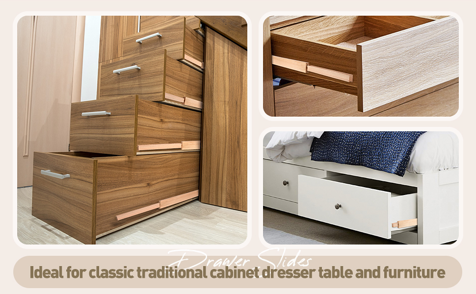 Maitys Wooden Drawer Slides combine traditional wood aesthetics with modern metal glides for a durable, corrosion-resistant, and smooth sliding experience. Designed for 16-inch drawers, these bottom-mount center guide tracks offer easy installation and customizable sizing, perfect for upgrading or replacing dresser rails with a touch of classic elegance.