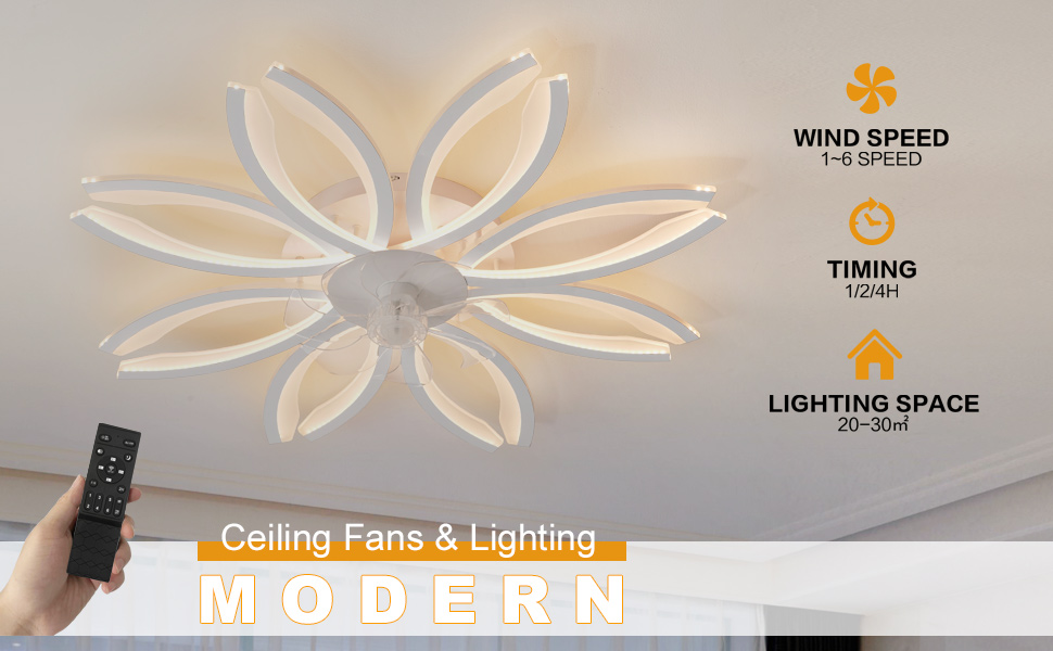 The 41" Modern Ceiling Fan with Lights and Remote Control combines a dimmable 150W LED flush mount light with a 6-speed reversible, ultra-quiet DC motor fan. Its unique flower-shaped acrylic design offers seamless light diffusion and modern aesthetics, perfect for living rooms, offices, and upscale interiors. Controlled remotely, it features stepless dimming, timer functions, and energy-efficient operation with a 20,000-hour LED lifespan.