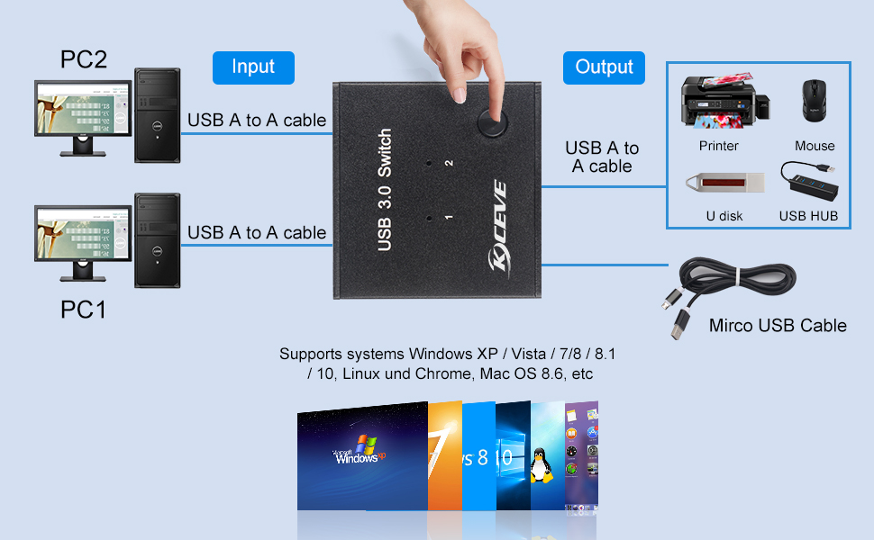 KCEVE USB 3.0 Switch Selector, 2 in 1 Out USB Switcher for 2 Computers Share 1 USB Devices, Mouse, Keyboard, Scanner, Printer, Etc