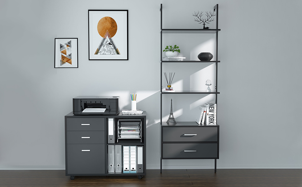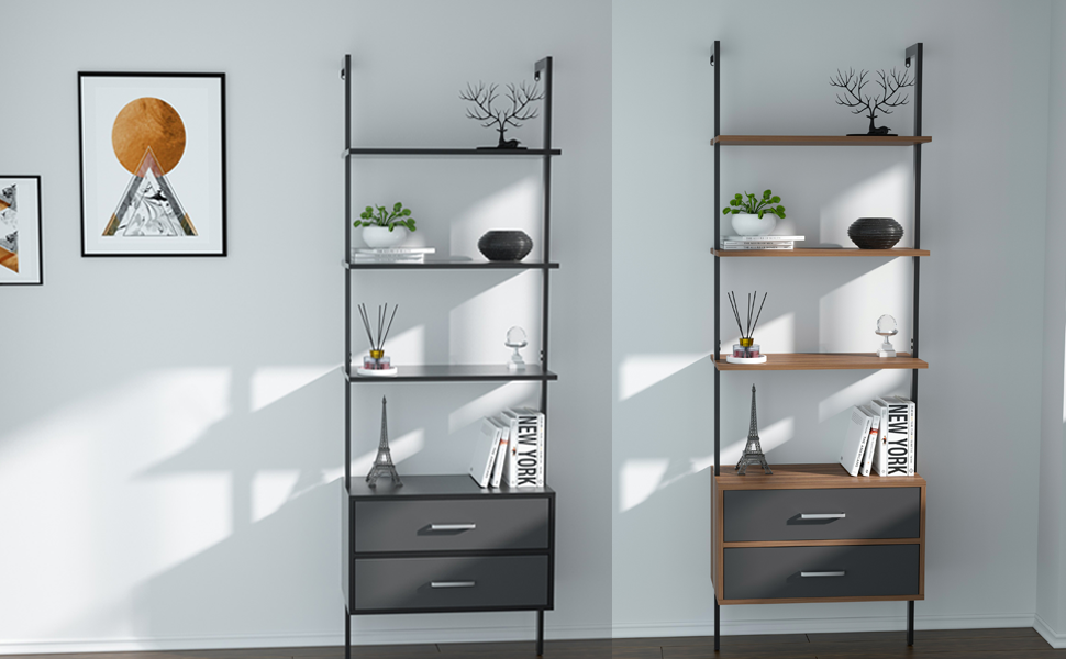 kevinplus Ladder Shelf, 5-Tier Wood Wall-Mounted Bookshelf with 2 Wood Drawers and Matte Steel Frame, Industrial Style Bookcase, Modern Storage Rack Shelves for Home Office (Black+Grey)