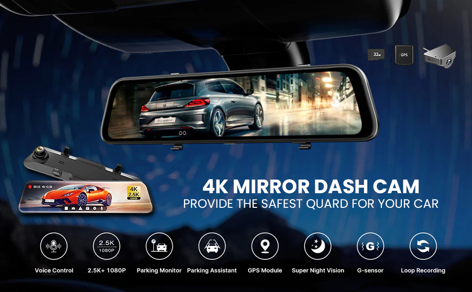 The BeQuest Quest For More Mirror Dash Cam combines ultra-high 4K front and 2.5K rear video capture with a sleek 12-inch full touch screen. Featuring a waterproof backup camera with WDR, night vision, and a G-sensor for automatic incident recording, itβs engineered for comprehensive, reliable road safety and effortless control. Perfect for professionals who demand clarity, durability, and smart features in one stylish package.