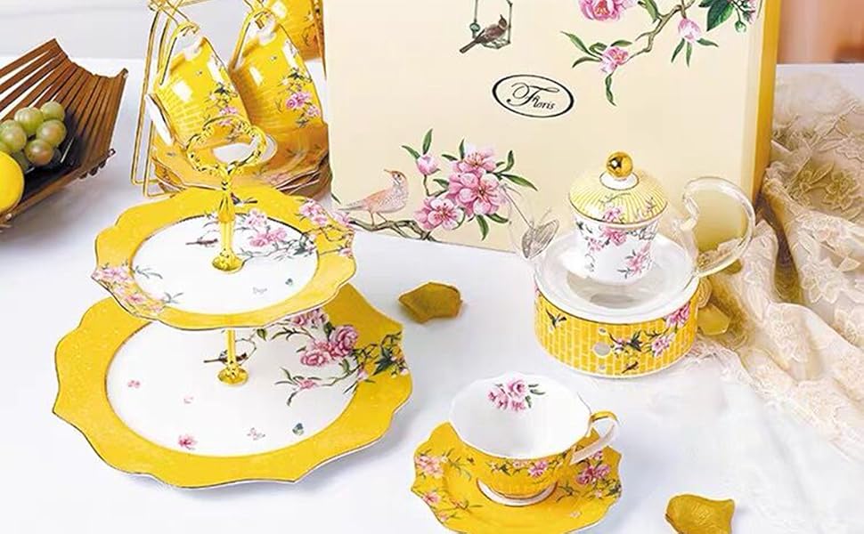 Pink Peony Flowers Pattern Ceramic Tea Cup with Saucer, Bone China Teacup for Afternoon Tea or Home Décor- Yellow (Cup and Saucer Set)