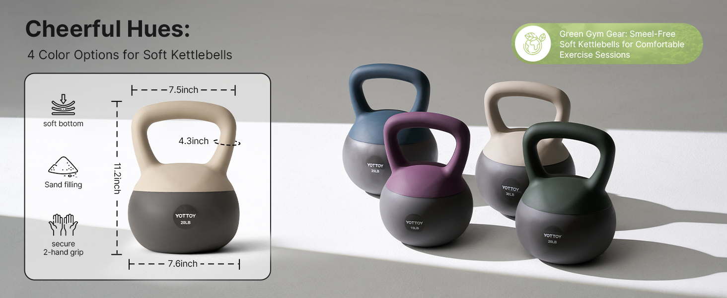 The YOTTOY Soft Kettlebell set combines a shock-absorbing sand-filled base with a wide, non-slip handle for superior grip and floor protection. Available in multiple weights from 10 to 30 lbs, it suits all fitness levels and training styles. Crafted from durable, odorless PVC, this kettlebell is designed for versatile strength training exercises, making it an ideal addition to any home gym.