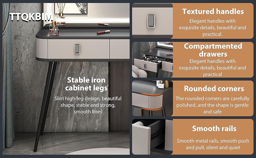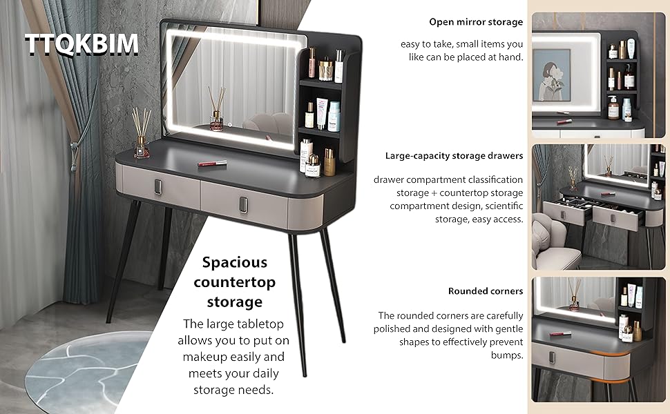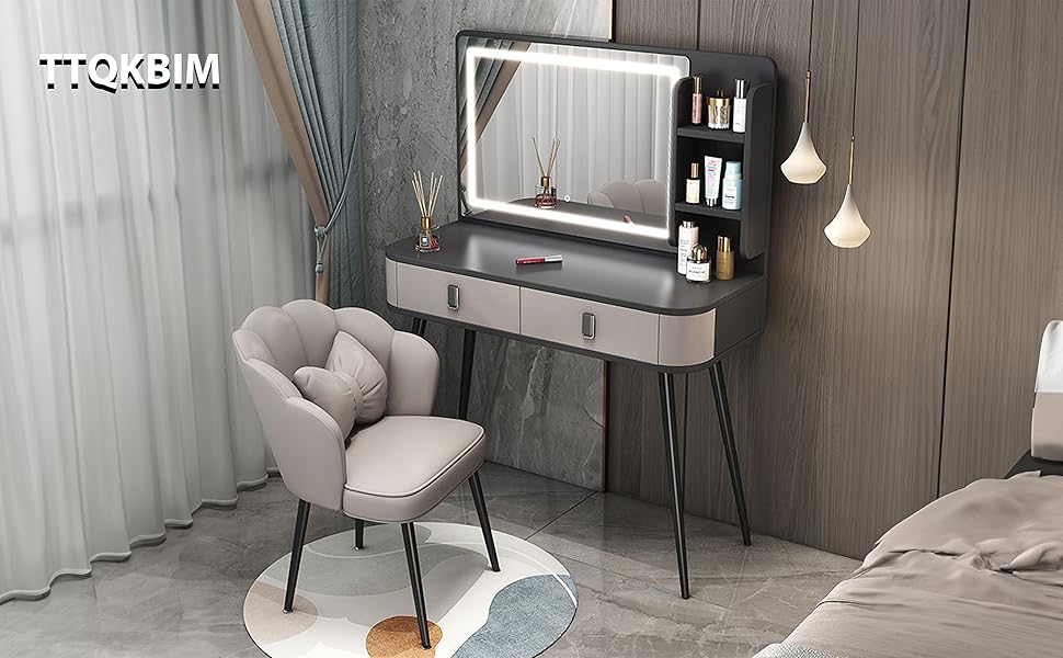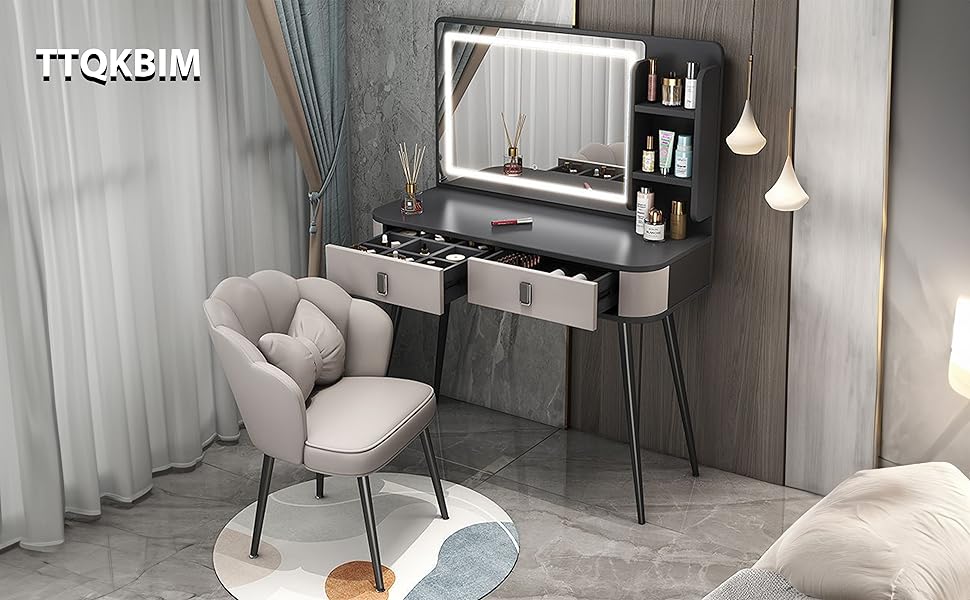 This 100x40cm grey dressing table features a 3-speed LED touch dimmer for customizable lighting, large-capacity segmented storage including drawers and an open side cabinet, and stable iron legs with a sleek high-foot design. Crafted from wood and weighing 40kg, it combines vanity, desk, bedside table, and storage functions into one elegant, space-saving piece perfect for modern millennial professionals.