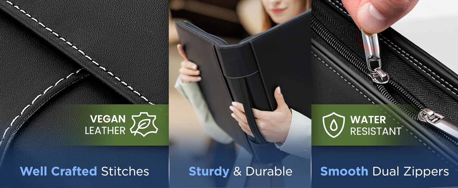 The STYLIO Zipper Portfolio is a premium leather business binder featuring a detachable clipboard, 1-inch 3-ring binder, and multiple compartments for tablet, phone, and documents. Designed with a retractable handle and dual zipper for easy transport and access, it offers water-resistant durability and reinforced stitching. Sized to fit letter documents and most briefcases, it’s a versatile organizer perfect for professionals and students, backed by a 1-year warranty.